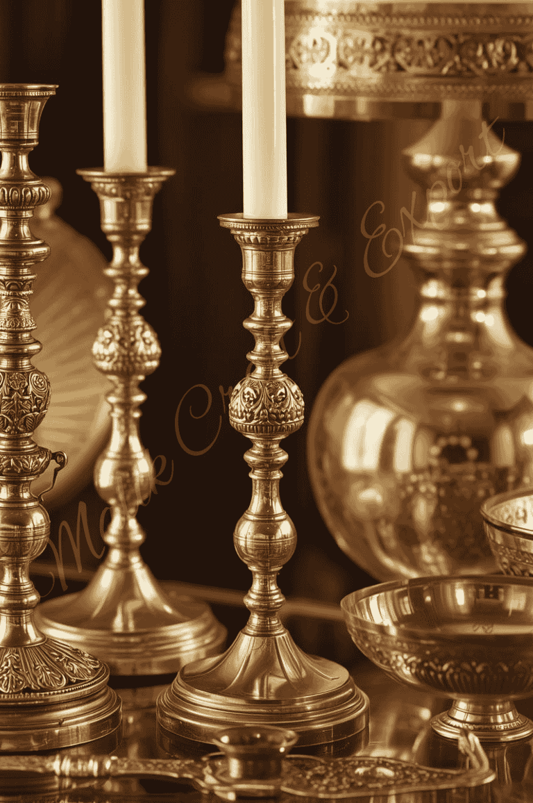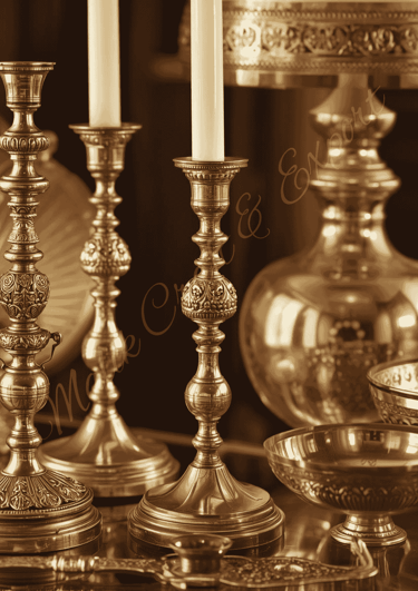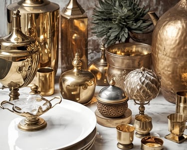 A collection of elegant brass and metal decorative items for a sophisticated home interior, featuring polished finishes and intricate detailing.