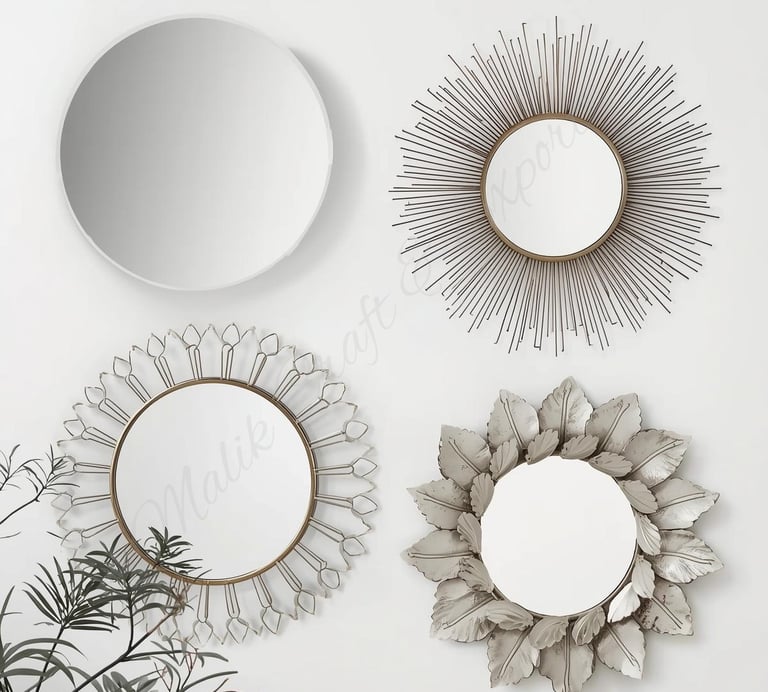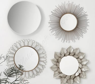 Elegant handcrafted mirrors in round, sunburst, and leaf designs — adding style and shine to any space.